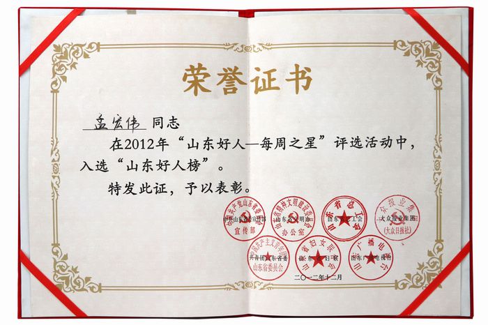 孟宏偉經(jīng)理榮獲山東好人榜